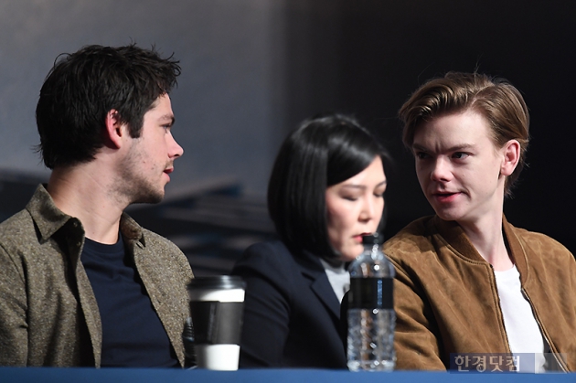 할리우드 배우 딜런 오브라이언, 토마스 생스터가 11일 오전 서울 여의도 콘래드 호텔에서 열린 영화 '메이즈 러너: 데스 큐어'(감독 웨스 볼) 내한 기자회견에 참석해 대화를 나누고 있다.