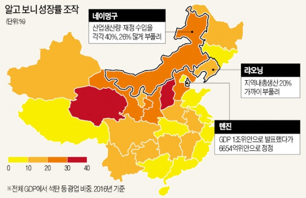 앞서 네이멍구 지방정부는 2016년 산업생산량과 재정수입을 실제보다 각각 40%, 26% 많게 부풀린 것이 들통났다. 지난해 7월 중국 공산당 중앙기율검사위원회의 내부 감사로 적발된 것이 8일 알려졌다. 네이멍구는 2차산업 비중이 GDP의 47%를 차지한다. 2015년 수치가 맞는다면 2016년 이 지역 경제가 13% 축소됐다는 의미다. 그게 아니라면 2015년 수치도 가짜라는 얘기가 된다.