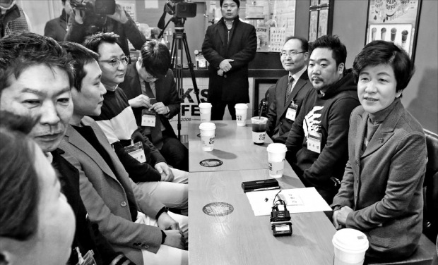 김영주 고용노동부 장관(맨 오른쪽)이 21일 서울 마곡동 빽다방 마곡나루역북부점을 찾아 본사 임직원, 가맹점주들과 간담회를 하고 있다. 이날 가맹점주들은 김 장관에게 “상생 정책을 시행하는 프랜차이즈 본사에 세제 혜택 등의 지원 대책을 마련해달라”고 요청했다.