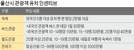 버스관광 인센티브로 내국인은 대당 하루 30만원을 여행사에 지원한다. 외국인은 최근 소규모 단체관광이 늘어나는 추세를 고려해 10~14명 15만원, 15~19명 30만원, 20명 이상 40만원 등 차등 지원한다.