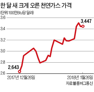 이날 미국 뉴욕상업거래소(NYMEX)에서 천연가스 1개월물 가격은 100만Btu(영국 열량단위)당 3.44달러를 기록했다. 한 달 전보다 30%가량 올랐으며 1년 전(3.382달러)보다도 높은 수준이다. 시장 전문가들은 북미지역에 기록적인 한파가 이어지고 있는 가운데 난방용 천연가스 수요가 늘어나 가격이 강세를 보이고 있다고 분석했다.공급 차질도 가격 상승의 주요 요인이다. 최근 캐나다 앨버타주 천연가스전은 한파로 동결 현상이 발생해 가스 생산에 차질을 빚었다. 재고가 떨어져 이달 초엔 뉴욕시에 도착한 천연가스 현물 거래가격이 지난 5일 100만Btu당 175달러를 찍기도 했다. 업계에서는 2월에도 추위가 누그러지지 않으면 당분간 오름세를 유지할 것으로 전망하고 있다.