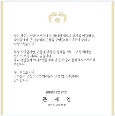 문 대통령은 "부상이 아쉽지만, 다음엔 더 좋은 성적을 거두고 더욱 위대한 선수로 우뚝 서리라 믿는다"며 "우리 국민과 아시아인들에게 더 큰 희망과 용기가 되어 주기 바란다"고 말했다.