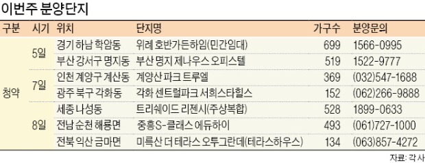 같은날 일성건설은 인천 계산동에서 ‘계양산 파크 트루엘’ 청약을 받는다. 지하 2층~지상 14층, 369가구(전용 59㎡) 규모다. 계양산, 오조산공원 등 녹지시설이 풍부하다. 8일 중흥건설은 전남 순천 신대리에서 ‘중흥 S-클래스 에듀하이’ 아파트 1순위 청약자를 모집한다. 493가구(전용 84~110㎡)로 이뤄졌다. 승평중학교가 단지 앞에 있고, 다음달 개교하는 신대초등학교도 가깝다.