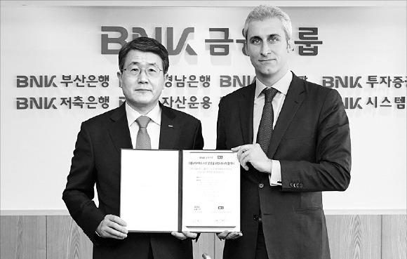 BNK금융그룹은 7일 부산 남구 부산은행 본점에서 글로벌 리서치업체인 캐나다 BCA리서치와 업무제휴를 맺었다. 성동화 BNK금융그룹 WM총괄부문장(왼쪽)과 앤드루 더글러스 BCA리서치 아시아영업본부장이 협약서를 들어 보이고 있다.