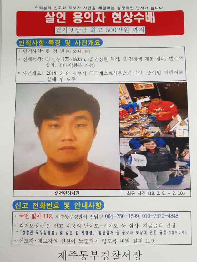 경찰이 제주도 게스트하우스 살인 용의자 한정민(남,32)을 공개수배하며 그의 신상이 공개됐다.