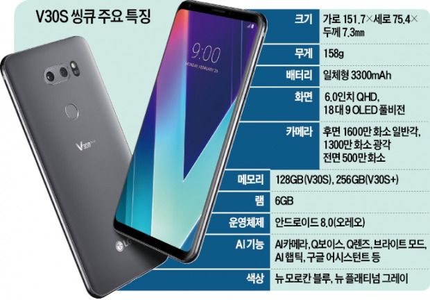 LG전자는 스페인 바르셀로나에서 26일 개막하는 MWC에서 V30S 씽큐를 공개한다. 국내에 다음달 9일 출시돼 같은날 사전예약자 개통을 시작하는 삼성전자 갤럭시S9과 맞대결에 도전한다. 출고가는 100만~110만원대로 책정될 전망이다. 조만간 미국 유럽 등지에서도 판매를 시작한다.