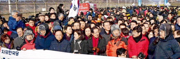한국당은 지난 24일 오후 7시부터 통일대교 남단 도로에서 연좌 농성에 돌입했다. 김성태 원내대표 등 당 지도부와 김영철 방한 저지 투쟁위원회 위원장을 맡은 김무성 의원 등이 참여했다. 김영철 방문 경로로 예상된 통일대교를 막고 ‘육탄 저지’에 나서겠다는 것이었다.