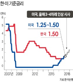 하지만 미국 중앙은행은 요즘 경기가 좋고 물가가 오를 기미를 보이자 기준금리 인상에 속도를 내려 하고 있다. 시장 전문가들은 미국 중앙은행이 올해 3~4차례 기준금리를 인상할 것으로 보고 있다. 만약 미국이 빠른 속도로 기준금리를 올리는 데 한국이 가만히 있으면 한국과 미국의 금리가 역전될 수 있다. 이렇게 되면 한국에 들어와 있던 자금이 고금리를 좇아 미국으로 빠져나갈 수 있다.