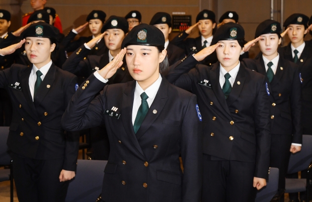 26일 서울 이화여대에서 열린 이화여대 학생군사교육단 입단 및 승급식에서 학군사관 후보생들이 국기에 대한 경례를 하고 있다. 이번 행사는 기초군사훈련을 마치고 정식 후보생으로 입단하는 2기와 지난 1년간 후보생 과정을 수료한 1기생들을 격려하기 위해 마련됐다.