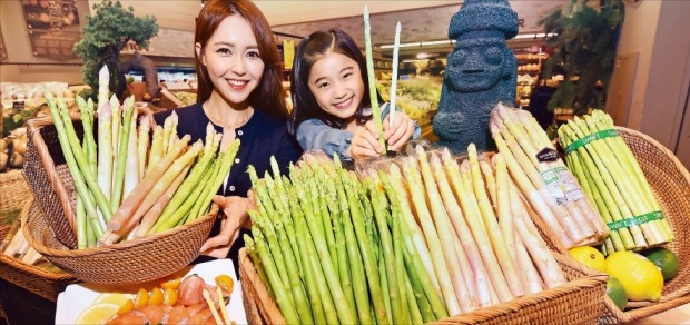 신세계백화점은 본점 강남점 영등포점 등 주요 점포에서 제주산 유기농 화이트 아스파라거스를 판매한다. 화이트 아스파라거스는 스테이크, 연어 등 요리에 곁들이기 좋다고 신세계는 설명했다. 가격은 100g당 4680원. 3일 신세계백화점 서울 본점 식품관에서 모델들이 화이트 아스파라거스를 소개하고 있다.