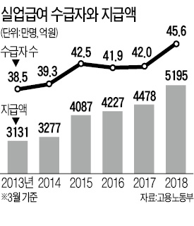 지급액 증가에는 최저임금 인상도 상당한 영향을 미쳤다는 분석이다. 작년보다 최저임금이 16.4% 오르면서 실업급여 지급액도 덩달아 늘어서다. 실업급여는 실직 전 직장에서 받던 평균 임금의 50%를 주되 상한액은 하루 최대 6만원, 하한액은 최저임금의 90%를 주도록 하고 있다.