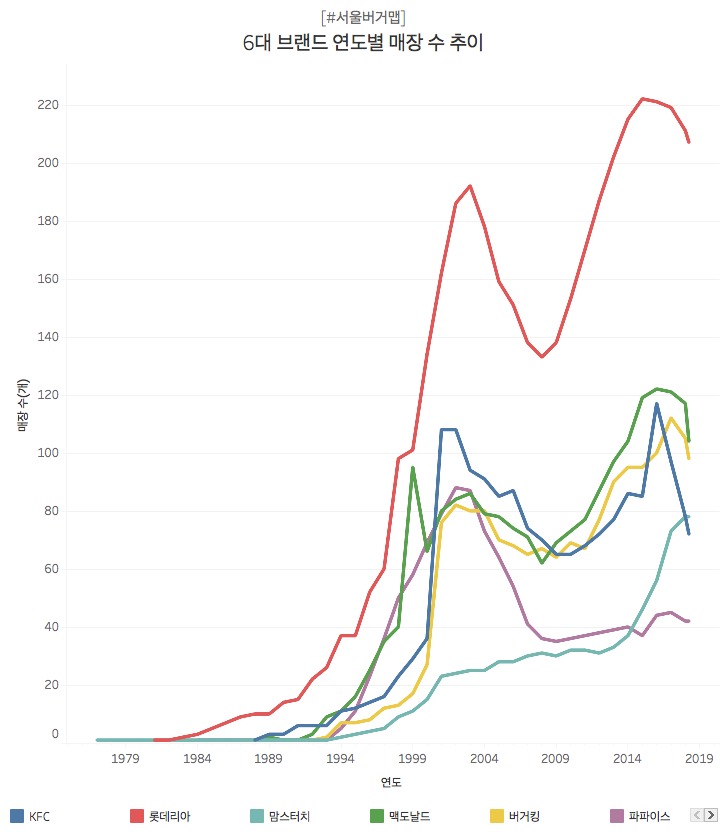 롯데리아는 서울 매장 수가 가장 많습니다. 2018년 4월 현재 서울에 매장 207곳을 운영합니다. 롯데리아는 1979년 1호점을 연 후 40년 간 매장 수 부동의 1위를 지키고 있습니다. 1999년 이후론 매장 수를 1년에 30여곳씩 늘리는 확장전략을 펼쳐왔죠. 그 결과 2000년~2018년까지 약 20년 간 매장 수에서 다른 5대 브랜드를 2배 이상 압도해왔습니다.