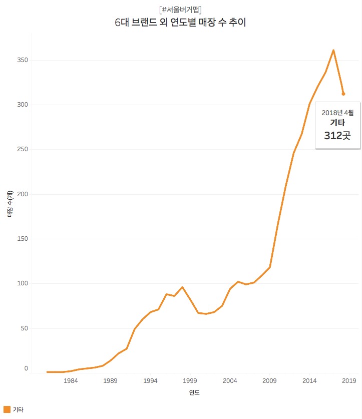 앞서 살펴본 6대 버거 브랜드(롯데리아·맥도날드·버거킹·파파이스·KFC·맘스터치) 중 맘스터치를 제외한 5개 브랜드가 2017년 대비 매장 수를 줄어든 것처럼, 수제버거 같은 자영업 일반 버거가게도 감소세입니다.