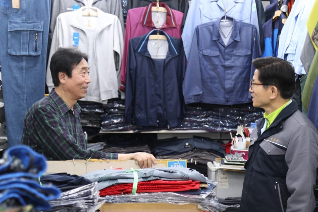 김문수 자유한국당 서울시장 후보가 17일 새벽 동대문 평화시장을 찾아 "오늘날 대한민국의 발전은 힘든 환경을 이겨내고 묵묵히 일해온 미싱(재봉틀) 여공들과 어린 시다(보조)들의 희생 덕분이다"라고 밝혔다.