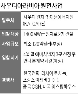 사우디 원전은 사막 위에 1400㎿급 원자로 2기를 건설하는 대형 프로젝트다. 사업비 규모가 최소 120억달러에 달한다. 한전이 주 계약자로 참여한 아랍에미리트(UAE) 원전은 같은 급 원자로 4기를 짓는 데 186억달러를 받는 계약을 맺었다. 한전을 비롯해 러시아 로사톰, 프랑스 EDF(아레바), 중국 CGN, 미국 웨스팅하우스 등 5개국 사업자가 치열한 수주 경쟁에 나선 상태다.이런 상황에서 미국 원자력협정이 한전의 발목을 잡을 수 있다. 한전의 수출형 원전인 ‘APR 1400’이 미국 웨스팅하우스의 ‘AP 1000’을 기초로 개발돼서다. 2009년 UAE 원전의 수출 계약을 맺을 때만 해도 한전은 원자로 계측제어시스템과 냉각재펌프, 핵심설계코드 등 3개 기술이 없었다. 한전 관계자는 “미국 기술을 사용하는 나라는 원전을 수출할 때 원자력협정에 따라 미국 정부 및 의회 동의를 얻어야 한다”며 “작년 기술 자립을 완료했지만 미국이나 웨스팅하우스가 인정하지 않을 가능성이 있는 만큼 분쟁 소지를 사전에 해소하는 게 중요하다”고 설명했다.