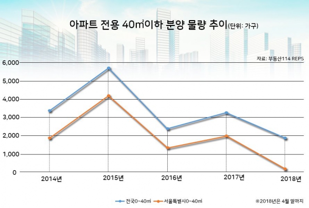 공급이 적은 만큼 시세 오름폭은 가파르다. 서울 송파구 가락동 ‘송파 헬리오시티’ 전용 39㎡ 분양권은 전매제한이 풀린 2016년 6월 경 4억7000만~4억8000만원 선에 거래 됐으나 지난 1월에는 8억7000만원에 실거래 신고 됐다. 1년 반 만에 4억 가량 오른 셈이다. 같은 기간 송파구 잠실동 ‘리센츠’ 전용 27㎡ 실거래가는 5억원 수준에서 7억8000만원까지 치솟았다. 삼성동 ‘현대힐스테이트 2단지’ 전용 40㎡는 2016년 7억3500만원에 실거래됐으나 지난 3월 10억5000만원에 팔렸다.이런 상황을 반영해 국내 초소형 아파트 공급 물량(일분분양 기준)도 서서히 증가하는 추세다. 부동산 114에 따르면 지난해 전국에 공급된 전용 40㎡ 이하 초소형 아파트는 3289가구로 집계됐다. 이 중 절반 이상인 2045가구가 서울에 공급됐다. 서울시 내 초소형 아파트 공급 물량은 분양이 많았던 2015년 4222가구까지 늘었다가 2016년 1391가구로 줄었으나 지난해 2000가구를 넘어섰다.