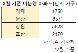 미분양 적체는 심각한 수준이다. 포항 ‘장성푸르지오’는 전체 1500가구 가운데 461가구가 미분양이다. 포항시에 따르면 3월 기준 미분양 아파트는 21개 단지 2170가구에 달한다. 거제는 34개월 연속으로 1000가구 이상 미분양이 이어지고 있다. 대우조선해양 인근에서 10월 입주를 앞둔 ‘거제코아루파크드림’은 767가구 중 절반이 넘는 408가구가 아직 계약자를 찾지 못했다. 그나마도 창원과 비교하면 사정이 좀 나은 편이다. 창원은 14개 단지 5628가구가 미분양이다. 영남권에서 가장 많은 수준이다. 지난해 분양률 허위 신고로 문제가 됐던 ‘창원월영사랑으로(4298가구)’의 비중이 높다. 후분양으로 입주자를 받은 ‘진해속천위드필오션베이(68가구)’는 아직도 60가구가 빈 집이다.