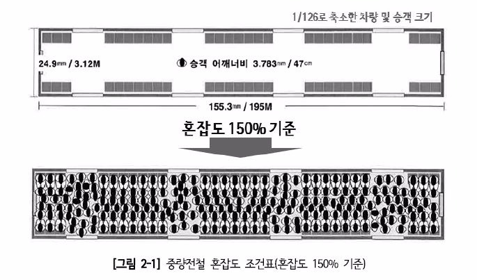 국토교통부는 '객차당 수송용량 기준'을 혼잡도 150%로 규정하고 있습니다. 좌석에 승객이 모두 앉아있고 객실 통로에 4열 입석, 출입문에 5열 입석한 상태입니다. 이 이상이 되면 열차 이용에 지장이 있다는 뜻입니다.