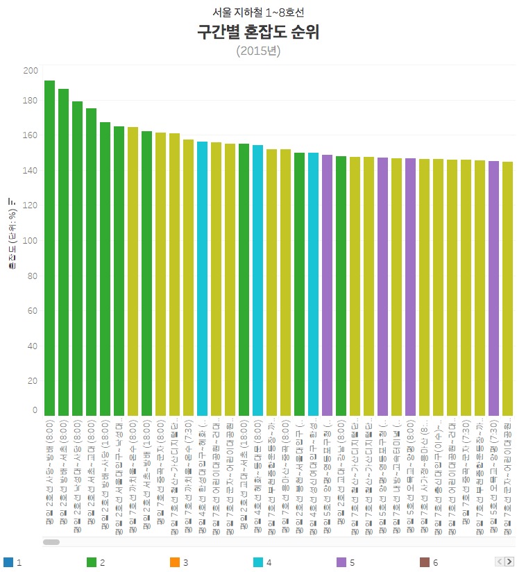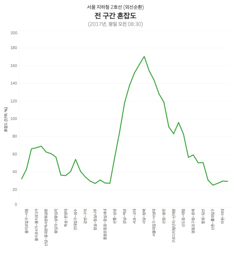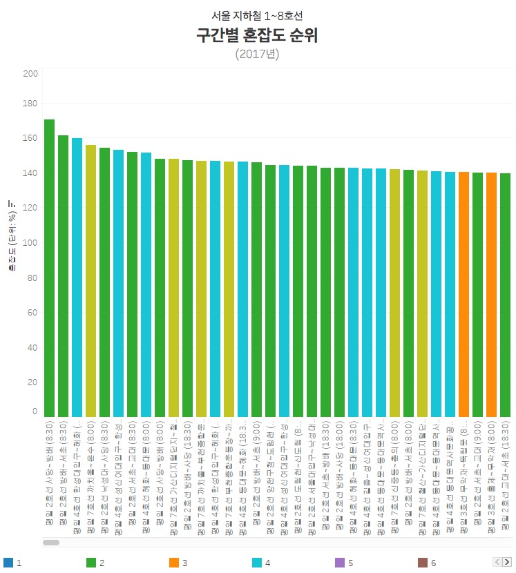 2017년 서울 지하철 역간 구간 전체 538곳 중 혼잡도 150%를 초과한 구간은 8곳입니다. 2호선 사당->교대 구간, 4호선 성신여대입구->동대문 구간이 주를 이룹니다. 8곳 모두 출근 시간대(오전 8시~9시 사이)입니다.