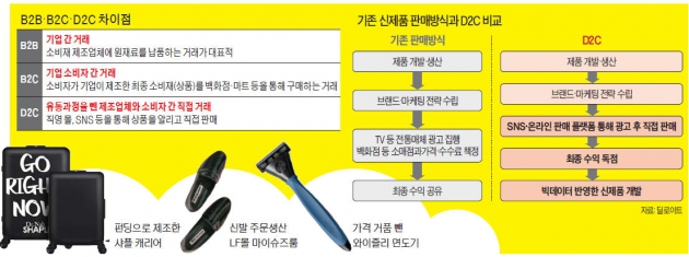 제조업체가 백화점 등 유통단계 없이 자체 온라인몰 등을 통해 소비자에게 직접 제품을 판매하는 D2C(direct to consumer)가 새로운 사업 모델로 떠오르고 있다. 유통 단계를 줄여 가격 경쟁력을 높이는 게 D2C의 가장 큰 특징이다. 이용자와 직접 소통함으로써 트렌드를 읽을 수 있다. 이를 마케팅과 신제품 개발에 활용할 수도 있다. 국내 스타트업(신생 벤처기업)부터 중견기업 대기업까지 D2C 모델을 도입하고 있다.