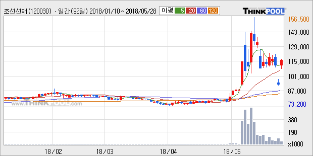 조선선재가 장 초반 부터 급등해서 오전 09시 17분 현재 전 거래일보다 +20.32% 오른 112,500원에 거래되고 있다. 주가의 흐름을 살펴보면 111,500원으로 개장해서 장중 한때 108,000원(+15.51%)까지 밀렸다가 다시 113,500원(+21.39%)까지 크게 올라 주가 변동폭이 큰 가운데, 현재는 112,500원(+20.32%)에서 머물고 있다.