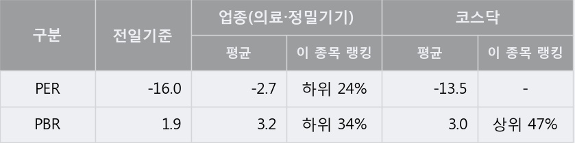 당기순이익 적자로 인해 이 종목의 PER는 마이너스이고, PBR은 1.9배이다. PER는 마이너스라서 의료·정밀기기업종의 평균 PER -2.7배 대비 -13.3배 낮은 수준이고, PBR은 의료·정밀기기업종의 평균 PBR 3.2배 대비 -1.3배 낮은 수준으로 업종 내에서 하위 34%에 위치한다.