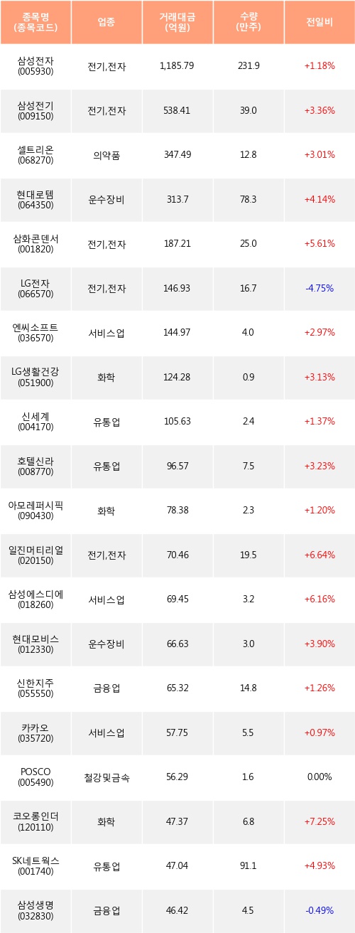 삼성전자, 삼성전기, 셀트리온 등은 전일 대비 주가가 상승했고, LG전자, 삼성생명 등은 주가가 하락했다.