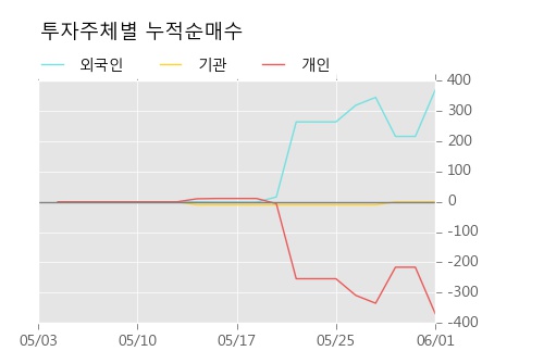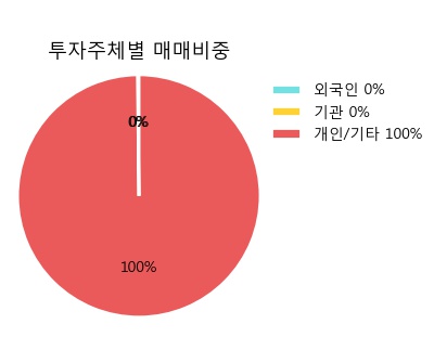 지난 한달을 기준으로 보면 외국인이 369주를 순매수했지만, 개인은 369주를 순매도했다. 기관의 순매수량에는 변동이 없다. 같은 기간 개인의 거래 비중이 99.8%로 가장 높았고, 기관은 거래에 거의 참여하지 않은 것으로 보인다