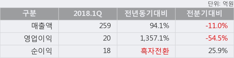 - 2018.1Q, 매출액 259억(+94.2%), 영업이익 20억(+1357.1%)