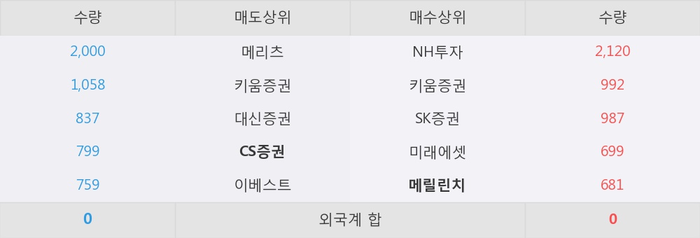 메릴린치가 매수상위 창구 5위를 기록중이고, 그 외에 NH투자, 키움증권 등이 매수 창구 상위에 위치하고 있다. 한편, 매도 창구 상위에는 CS증권이 눈에 띄고 있다.