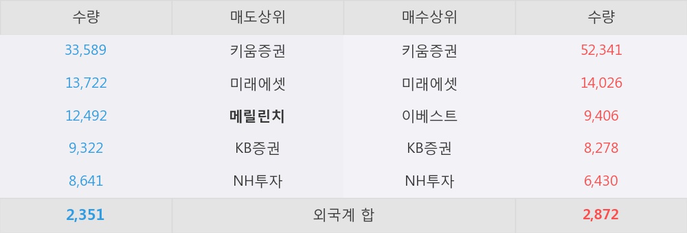 현재 거래원 동향은 키움증권, 미래에셋, 이베스트 등이 매수 상위 목록에 나타나고 있다. 한편, 매도 창구 상위에는 메릴린치가 눈에 띄고 있다.
