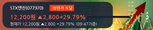 07일 STX엔진은 장 초반 부터 상한가에 진입해서, 오전 09시 47분 현재 전 거래일보다 29.79% 오른 12,200원에 거래되고 있다. 주가의 흐름은 9,490원으로 개장해서 장중 한때 9,220원(-1.91%)까지 살짝 밀렸지만, 다시 큰 폭으로 올라서 현재 12,200원(+29.79%)까지 상승하고 있다.