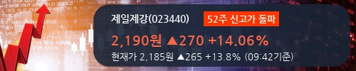 11일 제일제강은 장 초반 2,190원까지 오르며 지난 05월 10일 이후 1개월 여 만에 52주 신고가를 새로 썼다. 오전 09시 42분 현재 전 거래일보다 13.8% 오른 2,185원에 거래되고 있다. 주가의 흐름은 1,905원으로 개장해서 장중 한때 1,860원(-3.12%)까지 소폭 밀렸다가 다시 2,190원(+14.06%)까지 상승 반전한 후, 현재는 2,185원(+13.8%)에서 머물면서 장중에 많이 상승한 모습이다.