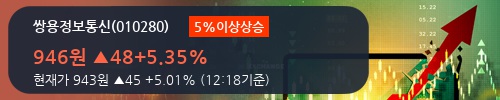 19일 오후 12시 18분 현재 쌍용정보통신은 전 거래일보다 5.01% 오른 943원에 거래되고 있다. 주가의 흐름을 살펴보면 880원으로 개장해서 장중 한때 878원(-2.23%)까지 소폭 밀렸다가 다시 946원(+5.35%)까지 상승 반전한 후, 현재는 943원(+5.01%)에서 머물면서 장중에 많이 상승한 모습이다.