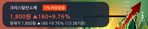 20일 오후 13시 38분 현재 크리스탈신소재는 전 거래일보다 9.76% 오른 1,800원에 거래되고 있다. 주가의 흐름을 살펴보면 1,640원으로 개장해서 장중 한때 1,635원(-0.3%)까지 살짝 밀렸지만, 다시 큰 폭으로 올라서 현재 1,800원(+9.76%)까지 상승하고 있다.