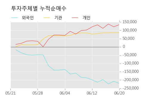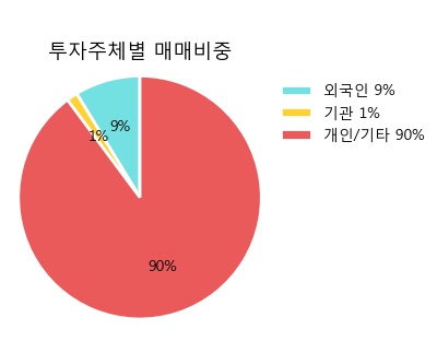 지난 한달을 기준으로 보면 기관이 8.4만주를 순매수했고, 개인들도 11.9만주를 순매수했다. 반면 그동안 외국인은 20.3만주를 순매도했다. 같은 기간 개인의 거래비중이 89.8%로 가장 높아, 주요 거래 주체로 참여했음을 알 수 있다.