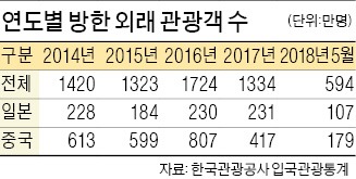 한국관광공사에 따르면 지난 5월 방한 일본인 관광객은 22만7000여 명으로 전년 동월 대비 43% 늘었다. 21만3853명이 방문해 29%의 증가세를 보인 4월의 기록을 뛰어넘는 수치다.지난해 일본 정부는 북한의 미사일 시험발사 등 도발행위가 이어지면서 자국민을 대상으로 한국 여행을 자제할 것을 권고했다. 독도와 위안부 합의 파기 문제로 한·일 양국의 갈등은 반일, 반한을 넘어 혐일, 혐한 감정으로 격화됐다. 2016년 한 해 25%의 가파른 증가세를 보이던 방한 일본인 관광객은 급격히 줄어들어 지난해 0.6% 증가에 그쳤다.