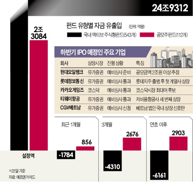 24일 금융정보업체 에프앤가이드에 따르면 국내 공모주 펀드(112개, 설정액 2조3084억원)에 올해 들어 2903억원이 순유입됐다. 최근 한 달간 856억원을 포함해 석 달간 2676억원이 집중적으로 몰렸다. 지난해 상반기 공모주 펀드에서 1조2741억원이 순유출된 것과 대조적인 흐름이다.