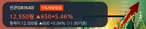 25일 오전 11시 30분 현재 인콘은 전 거래일보다 5.04% 오른 12,500원에 거래되고 있다. 주가의 흐름은 11,950원으로 개장해서 장중 한때 11,900원(0%)까지 소폭 밀렸다가 다시 12,550원(+5.46%)까지 상승 반전한 후, 현재는 12,500원(+5.04%)에서 머물면서 장중에 많이 상승한 모습이다.