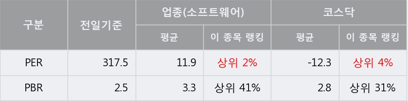 전일 종가를 기준으로 이 종목의 PER는 317.5배, PBR은 2.5배이다. PER는 소프트웨어업종의 평균 PER 11.9배 대비 +305.6배 높은 수준으로 업종 내에서 상위 2%에 있고, PBR은 소프트웨어업종의 평균 PBR 3.3배 대비 -0.8배 낮은 수준으로 업종 내에서 상위 41%에 위치한다. 보통 높은 PER는 기업의 높은 이익증가율에 대한 시장의 기대가 반영된 것으로 해석될 수도 있다.