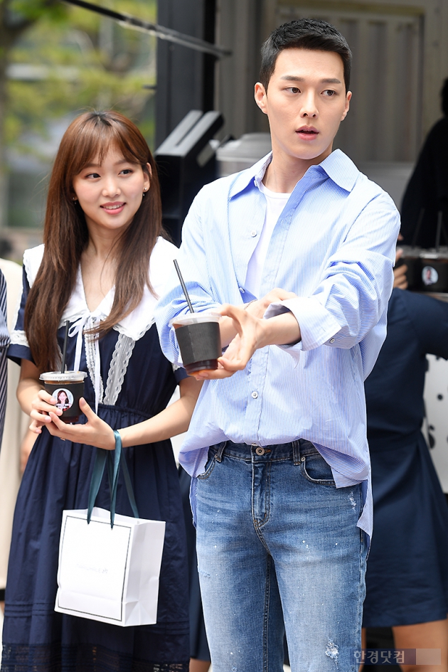 배우 진기주, 장기용이 27일 오후 서울 상암동 MBC 앞 광장에서 열린 수목 미니시리즈 '이리와 안아줘'(극본 이아람, 연출 최준배) 커피차 이벤트에 참석해 커피를 나눠주고 있다.