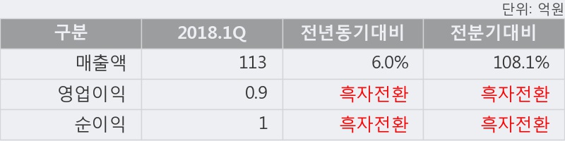 - 2018.1Q, 매출액 113억(+6.0%), 영업이익 0.9억(흑자전환)