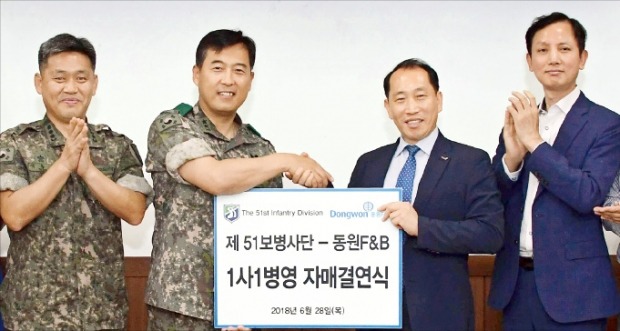 종합식품기업 동원F&B와 육군 제51보병사단이 28일 경기 수원 51보병사단에서 ‘1사1병영’ 자매결연을 했다. 이날 협약식에는 김인건 사단장을 비롯해 부대 관계자와 김명식 상무(수원공장장), 서정동 동원그룹 홍보실장 등 기업 관계자들이 참석했다.