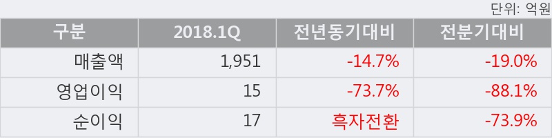 - 2018.1Q, 매출액 1,951억(-14.7%), 영업이익 15억(-73.7%)