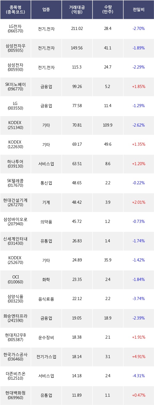 SK이노베이션, KODEX 레버리지, 하나투어 등은 전일 대비 주가가 상승했고, LG전자, 삼성전자우, 삼성전자 등은 주가가 하락했다.
