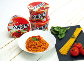 농심은 또 길이가 긴 스파게티면을 용기에 둘둘 말아 넣기 위해 네스팅 공법을 적용했다. 2008년 둥지냉면 출시 때 개발한 기술로 면이 뽑혀 나오면 뜨거운 바람으로 새 둥지 모양으로 돌려가며 건조시킨다. 토마토 분말 스프에 올리브풍미유를 넣어 갓 조리한 스파게티의 맛과 향을 살렸다는 게 회사 측 설명이다.