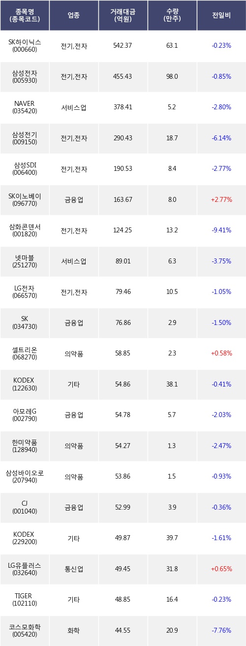 SK이노베이션, 셀트리온, LG유플러스 등은 전일 대비 주가가 상승했고, SK하이닉스, 삼성전자, NAVER 등은 주가가 하락했다.