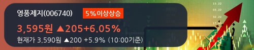 02일 오전 10시 00분 현재 영풍제지는 전 거래일보다 5.9% 오른 3,590원에 거래되고 있다. 주가의 흐름을 살펴보면 3,390원으로 개장해서 장중 한때 3,370원(-0.59%)까지 소폭 밀렸다가 다시 3,595원(+6.05%)까지 상승 반전한 후, 현재는 3,590원(+5.9%)에서 머물면서 장중에 많이 상승한 모습이다.