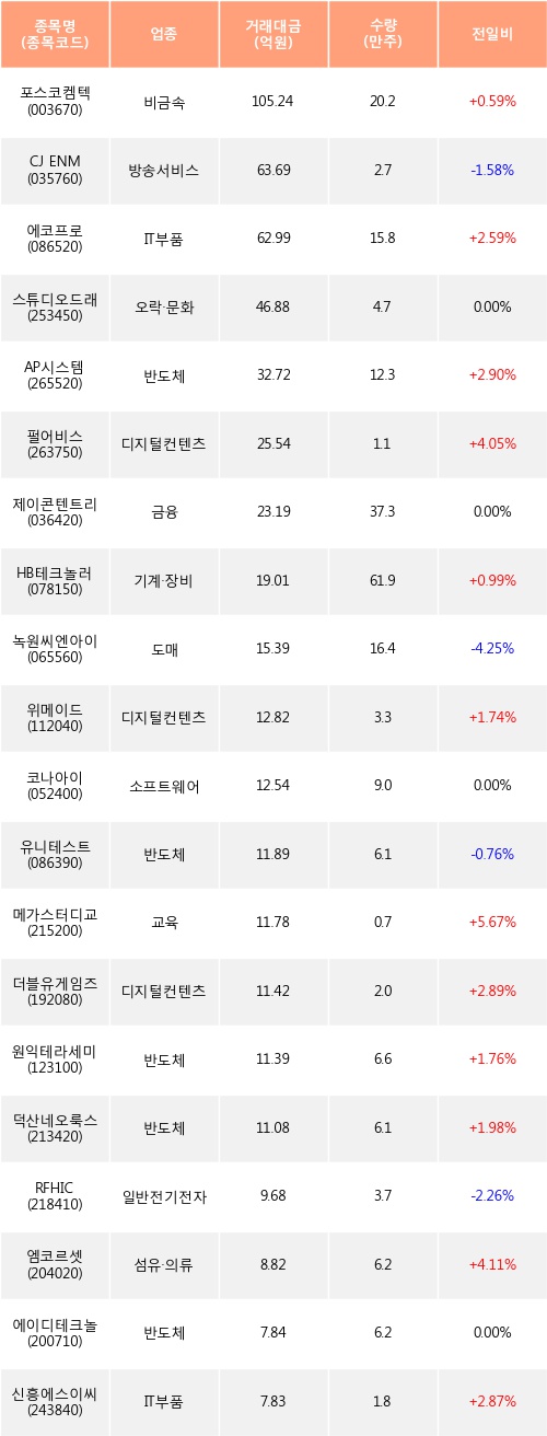 기관 투자자의 순매수 상위 20개 종목은 포스코켐텍, CJ ENM, 에코프로, 스튜디오드래곤, AP시스템, 펄어비스, 제이콘텐트리, HB테크놀러지, 녹원씨엔아이, 위메이드등이다.