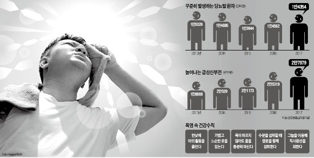 [ 이지현 기자 ] 연일 계속되는 폭염에 만성질환자 건강관리에도 비상등이 켜졌다. 날씨가 더워지면서 입맛이 없어 식사를 불규칙하게 하거나 당분이 높은 아이스크림, 주스, 과일 등을 많이 먹는다. 운동량이 줄면 당뇨 환자는 혈당을 조절하는 데 어려움을 겪는다. 고혈압 환자도 마찬가지다. 무더위에 체온이 높아지면 몸속 혈관이 확장돼 땀을 많이 흘린다. 혈압이 과도하게 낮아지는 저혈당 쇼크 증상을 겪기 쉽다. 당뇨, 고혈압, 신장병 등 만성질환자들이 폭염 속 건강을 지키는 법에 대해 알아봤다.